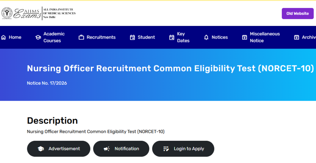 1. AIIMS NORCET 10 Nursing Officer Exam City के लिए आधिकारिक वेबसाइट aiimsexams.ac.in पर जाएं।