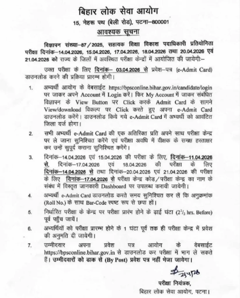 अगर आपने इस भर्ती के लिए आवेदन किया है, तो BPSC AEDO Admit Card (हॉल टिकट) डाउनलोड करना आपका प्रमुख उद्देश्य होना चाहिए और नोटिस भी जारी कर दिया गया है 2 अप्रैल 2026 को कैसे डाउनलोड करना है एग्जाम सिटी कब का लिंक जारी किया गया है।