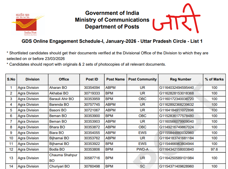 | उत्तर प्रदेश (UP) | [GDS Merit List PDF 2026] |