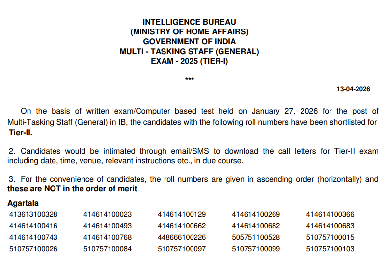 इंटेलिजेंट ब्यूरो में मल्टीटास्किंग स्टाफ के लिए जो भर्ती आई थी 362 पद के लिए उसके लिए आपने तैयार वन की परीक्षा दी थी अब उसका रिजल्ट आज 13 अप्रैल 2026 को जारी कर दिया गया है दोपहर के वक्त तुरंत चेक करें क्योंकि आपको पता है परीक्षा आपके 27 जनवरी को आयोजित की गई थी जिसके लिए एडमिट कार्ड 24 जनवरी को फाइनल जारी किया गया था और उत्तर कुंजी अपने 29 जनवरी 2026 को चेक किया था।