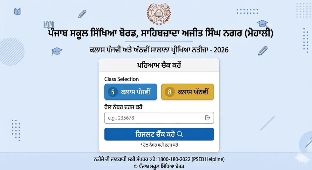 पंजाब स्कूल एजुकेशन बोर्ड (PSEB) लाखों छात्रों की कक्षा 5वीं और 8वीं की परीक्षाएं आयोजित करता है। ये क्लासेस छात्रों के लिए बहुत महत्वपूर्ण होती हैं क्योंकि इन्हीं पर आगे की पढ़ाई की नींव टिकती है। कक्षा 5वीं और 8वीं का रिजल्ट 2026 घोषित होने वाला है और हर माता-पिता व छात्र इस बात को लेकर उत्सुक और थोड़ा घबराया हुआ भी होता है कि उनका या उनके बच्चे का रिजल्ट कैसा आया। अगर आप भी PSEB 5th या 8th Result 2026 चेक करने का तरीका ढूंढ रहे हैं,