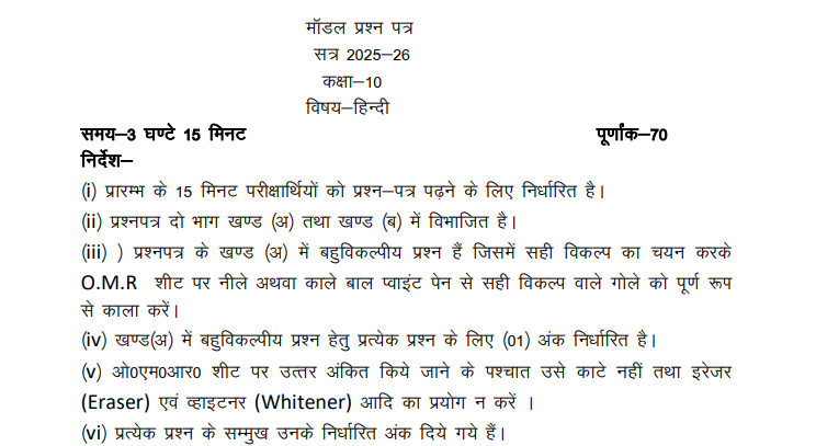 18 फरवरी यूपी बोर्ड कक्षा 10 हिंदी मॉडल पेपर 2026