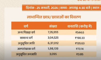 जिसमें अन्य पिछड़ा वर्ग सामान्य वर्ग के साथ अनुसूचित जाति और अनुसूचित जनजाति के साथ अल्पसंख्यक वर्ग शामिल हैं जिनको छात्रवृत्ति ट्रांसफर किया गया है अभी तक 1878000 छात्र-छात्राओं के बैंक अकाउंट खाते में पैसा ट्रांसफर किया गया है 2025 और 26 के सभी उम्मीदवार जिनके आधार से लिंक बैंक अकाउंट खाता था उनका पैसा 944.55 करोड रुपए की छात्रवृत्ति अभी तक भुगतान किया जा चुका है।
