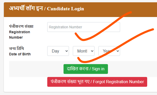 3. लॉगिन डिटेल्स भरें: अब आपको अपना रजिस्ट्रेशन नंबर (जो आवेदन के समय मिला था) और जन्म तिथि (Date of Birth) दर्ज करनी होगी।
