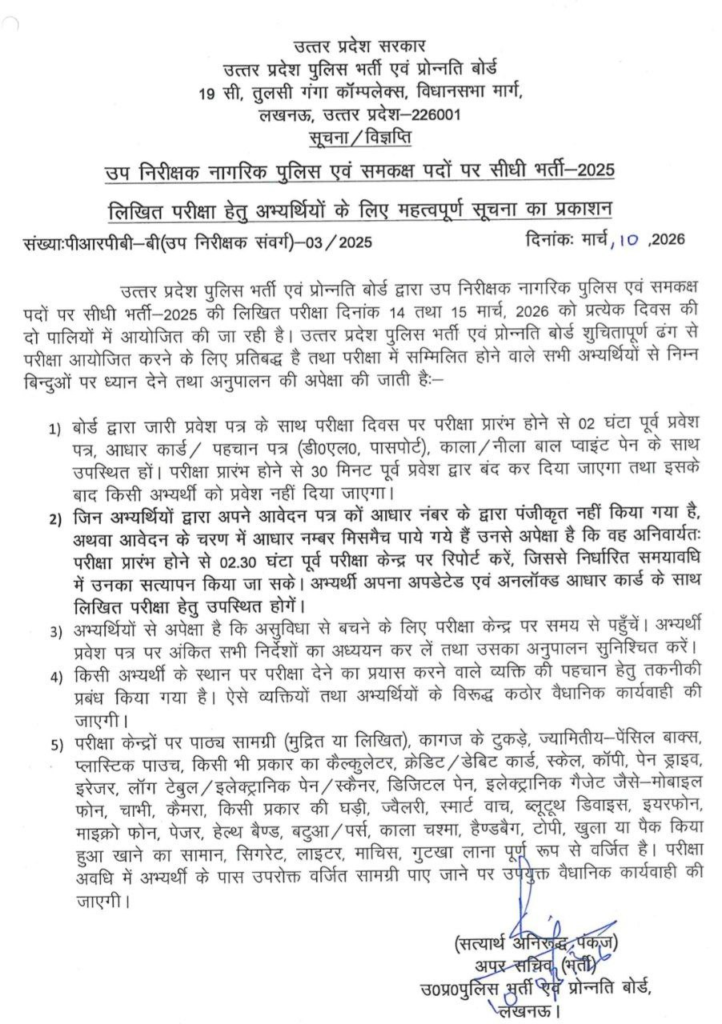 उत्तर प्रदेश सब इंस्पेक्टर दरोगा भर्ती 14 और 15 मार्च 2026 के लिए एडमिट कार्ड ऑनलाइन लाइव यहां से चेक करें डायरेक्ट लिंक है: