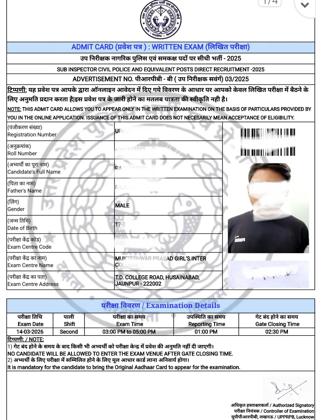 UP SI Admit Card 2026 : में दिया गया विवरण